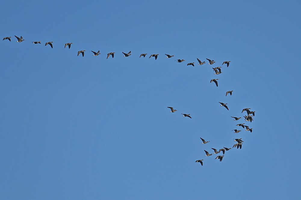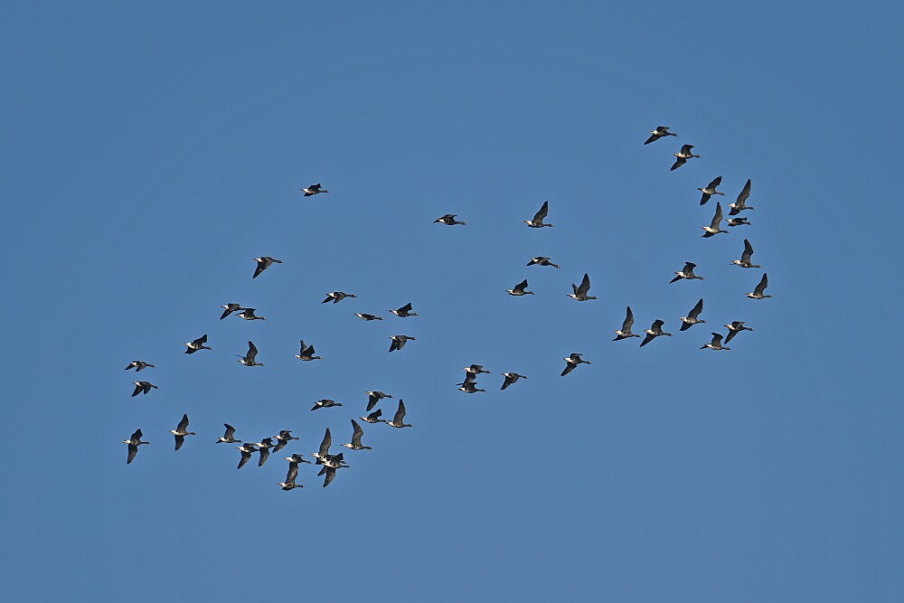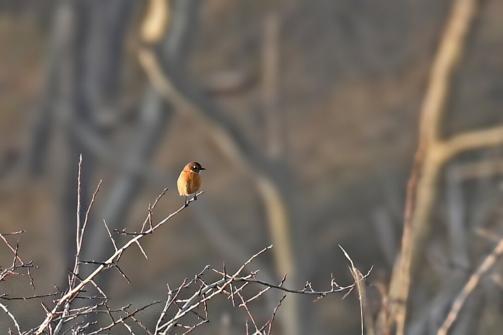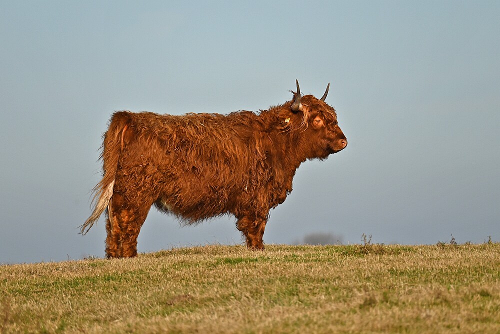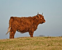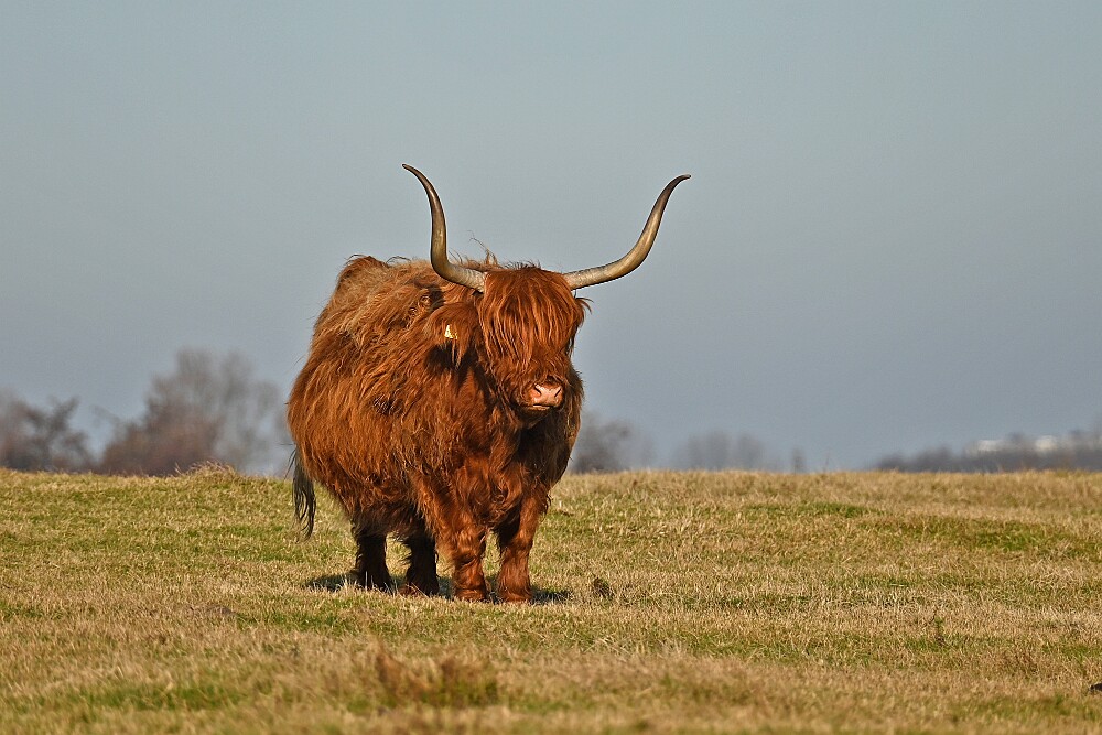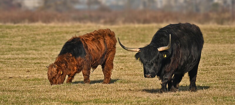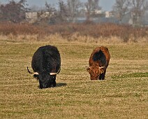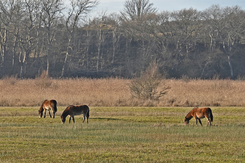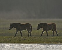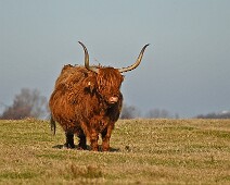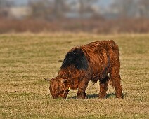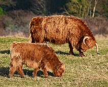 Schotse Hooglander 'Zwartvlek' (1 jaar oud) met moeder Exmoor Pony's Overtrekkende Kolganzen Putter Overtrekkende Kolganzen Roodborsttapuit Mistige zon Exmoor Pony's 04-02-2026 Wassenaar Lentevreugd