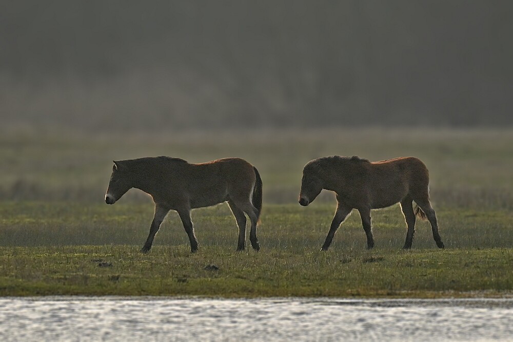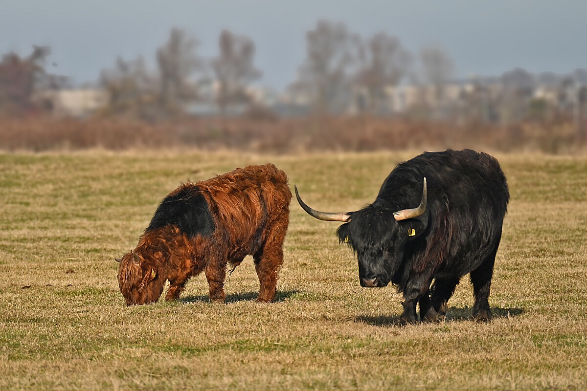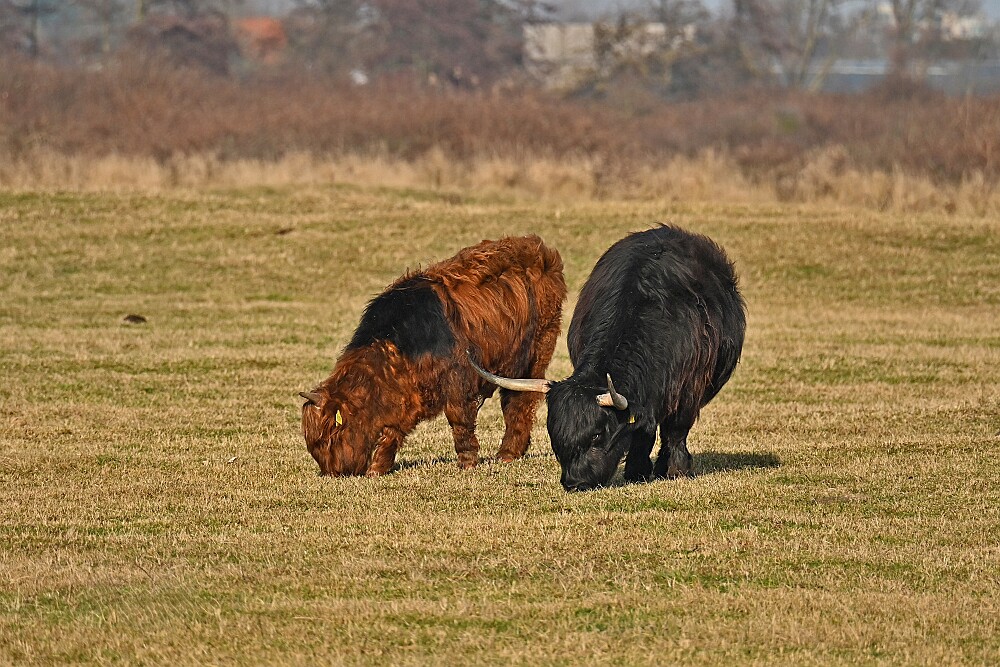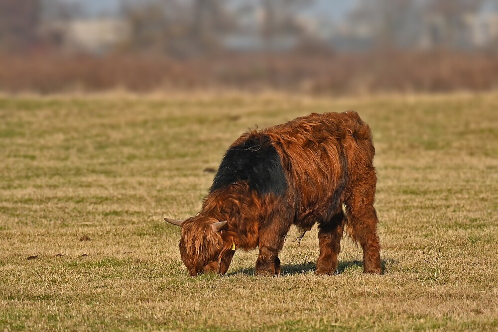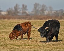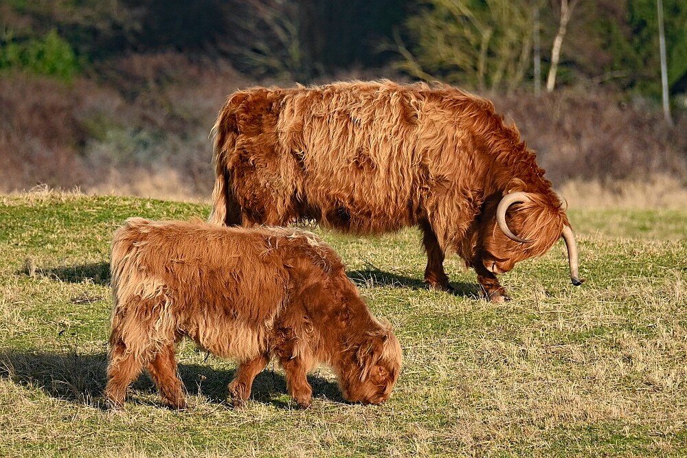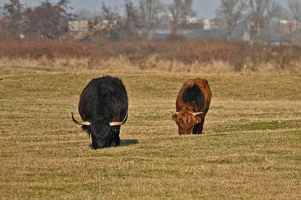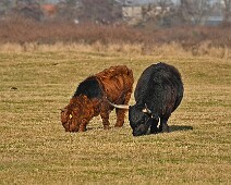 Schotse Hooglander 'Zwartvlek' (1 jaar oud) met moeder Exmoor Pony's Overtrekkende Kolganzen Putter Overtrekkende Kolganzen Roodborsttapuit Mistige zon Exmoor Pony's 04-02-2026 Wassenaar Lentevreugd