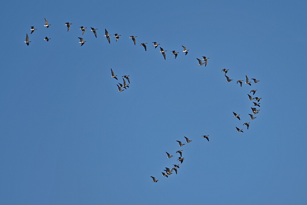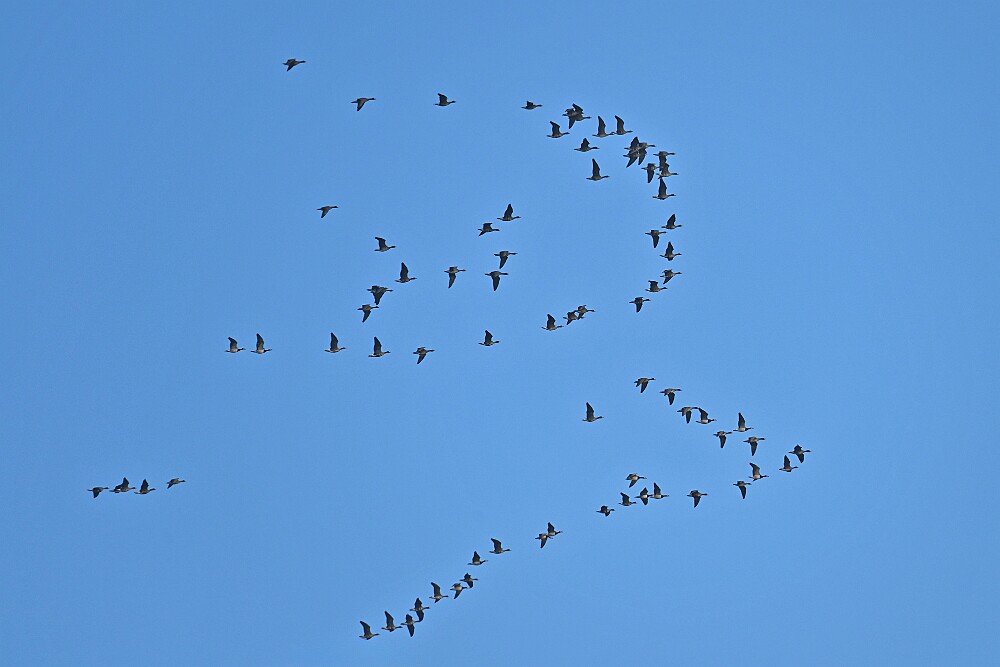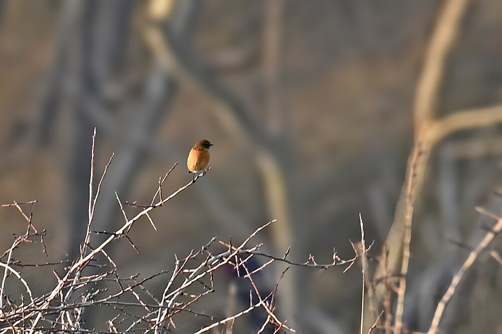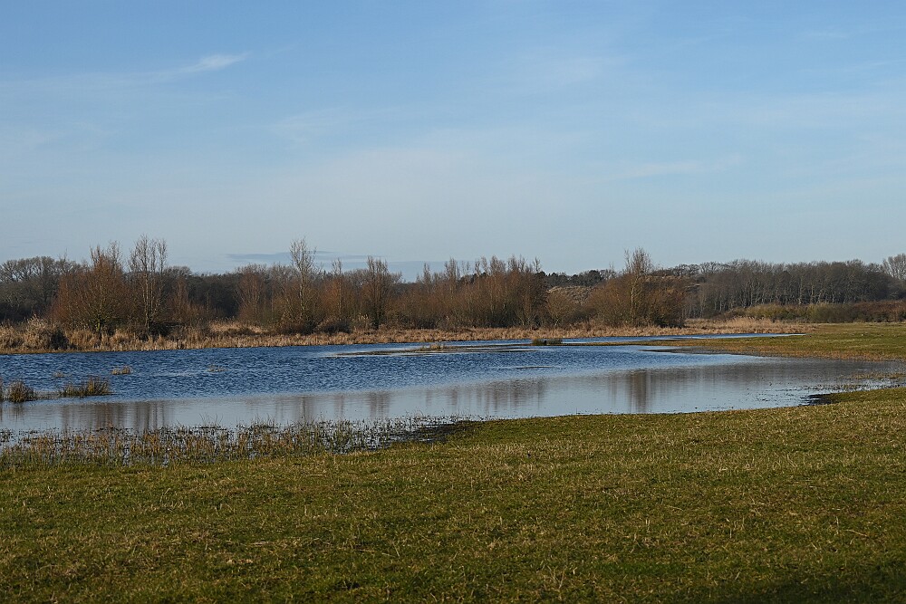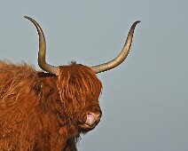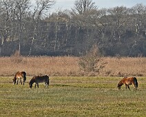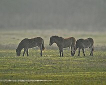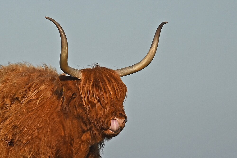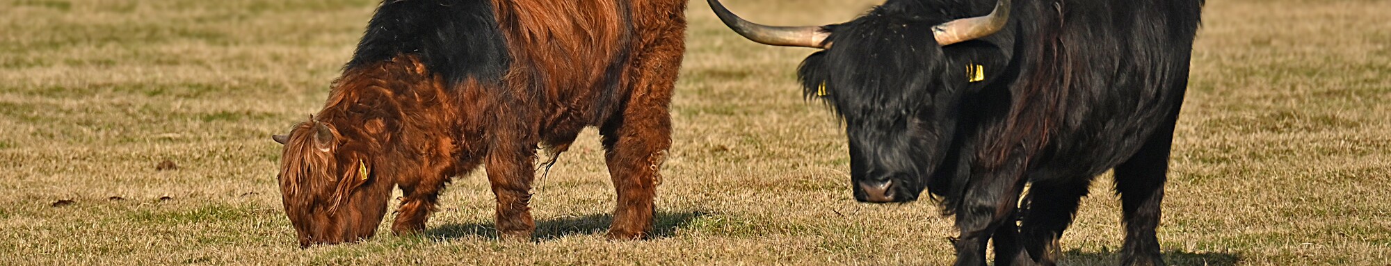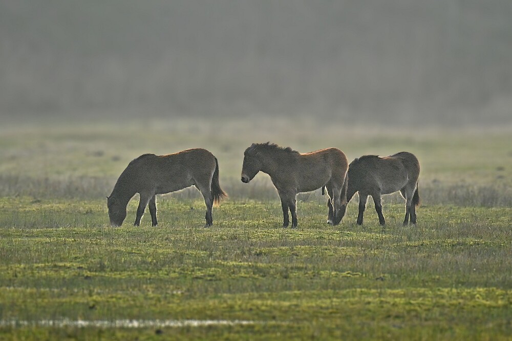 Schotse Hooglander 'Zwartvlek' (1 jaar oud) met moeder Exmoor Pony's Overtrekkende Kolganzen Putter Overtrekkende Kolganzen Roodborsttapuit Mistige zon Exmoor Pony's 04-02-2026 Wassenaar Lentevreugd